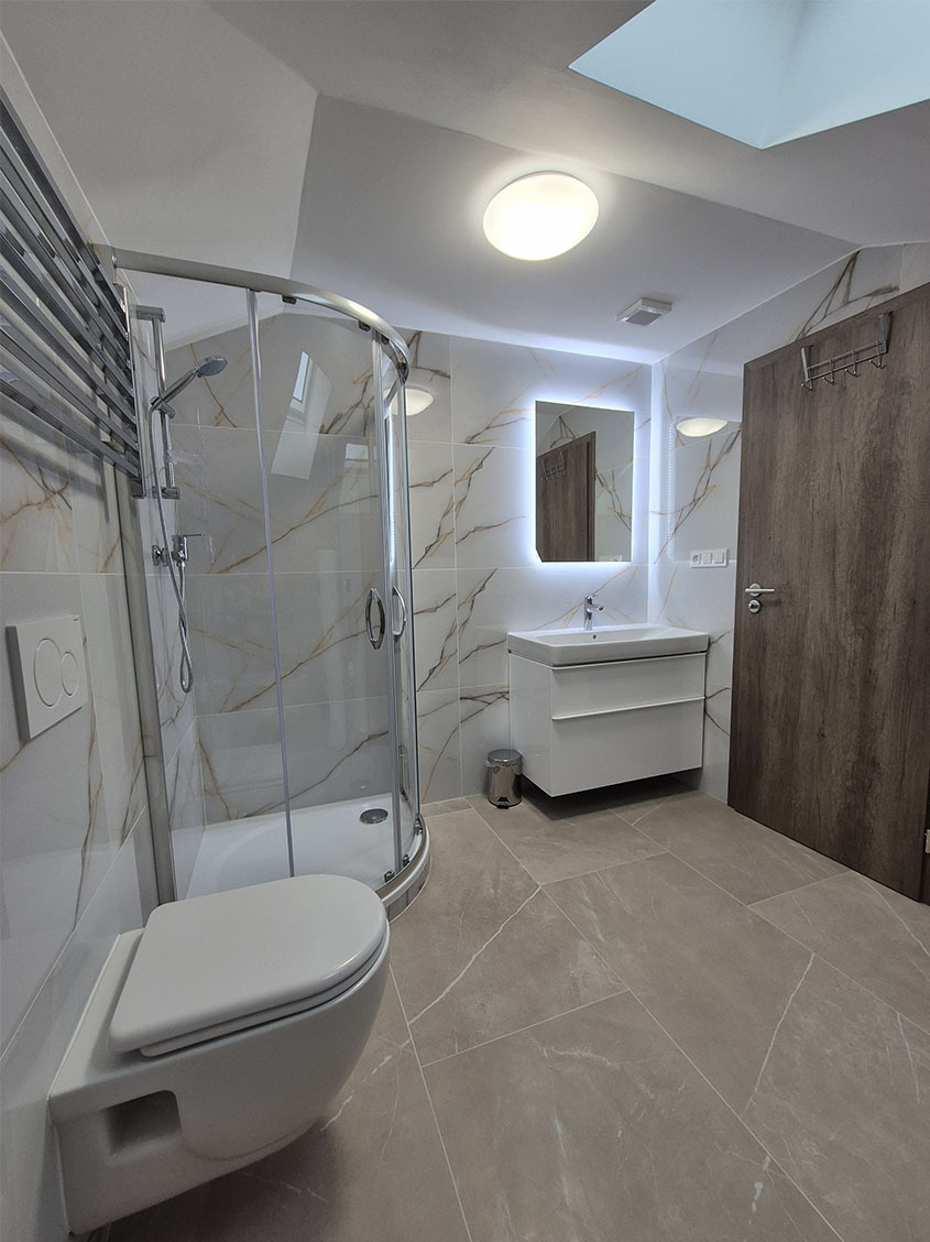 - V domě jsou čtyři toalety. Jedna v koupelně v přízemí a druhá samostatná v zádveří. Další dvě koupelny se sprchovým koutem a WC jsou součástí každé ložnice v podkroví. V koupelně v přízemí si můžete zvolit pohodu v rohové vaně nebo klasiku ve sprchovém koutě. V technické místnosti naleznete pračku a sušičku.