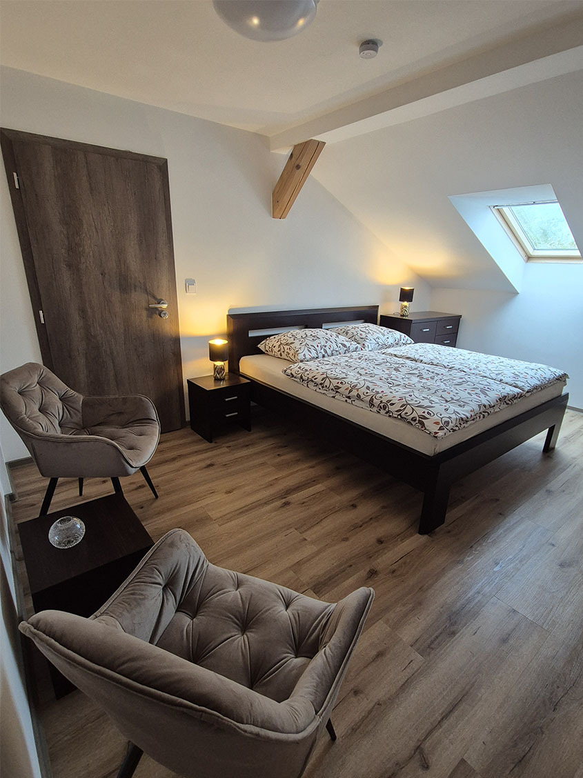 - Uvnitř vás čeká pět pohodlných ložnic s manželskými lůžky a jedna s prostornou vestavěnou šatnou, kam můžete schovat vše, co nechcete mít na očích. Běžně je v jedné z ložnic dřevěná dětská postýlka a jedna cestovní je uložena v šatně. Všech pět ložnice má svoji LED TV, ložnice v podkroví jsou klimatizovány.